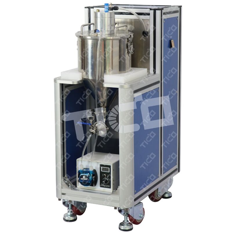 The slurry feeding system is engineered to feed precise and consistent slurry for lithium-ion battery coating processes. Equipped with an adjustable-speed peristaltic pump, it achieves high-accuracy flow control for uniform coating applications. An integrated buffer tank with mixing mechanism prevents slurry settlement, ensuring homogeneous slurry feeding. This design combines process reliability with user-friendly operation, making it ideal for advanced battery production and research.